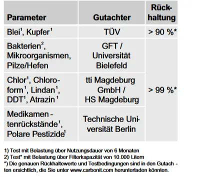 Aktivkohle ist ein auf natürlichen kohlenstoffhaltigen Rohstoffen (z.B. Holz, Torf, Braunkohle, Steinkohle) basierendes Material, welches durch seine poröse Struktur und der dadurch extrem großen inneren Oberfläche chemische Verbindungen und Moleküle bindet. Das Wasser strömt durch sehr kleine Poren des Aktivkohle-Filtermaterials. Hierbei werden ungelöste Teilchen, die größer sind als die Filterporen, physikalisch filtriert und damit zurückgehalten. Darüber hinaus werden Stör-Stoffe chemisch absorptiv an die Aktivkohle gebunden. Durch diese absorptive Aktivkohle-Bindung sollen die Stoffe auch bei Sättigung des Filters nicht wieder an das Wasser abgeben werden.
