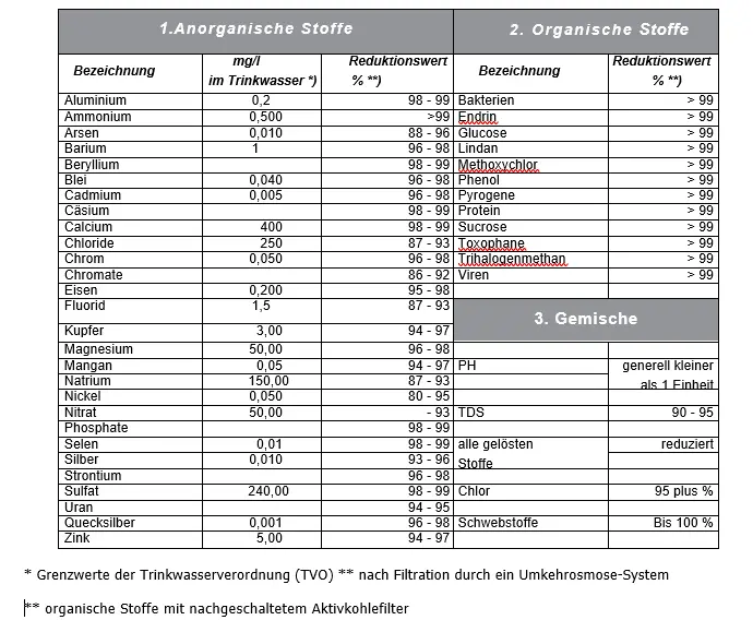 Tabelle: Überblick über die durch Umkehrosmoseanlagen typisch reduzierten Wasserschadstoffe: