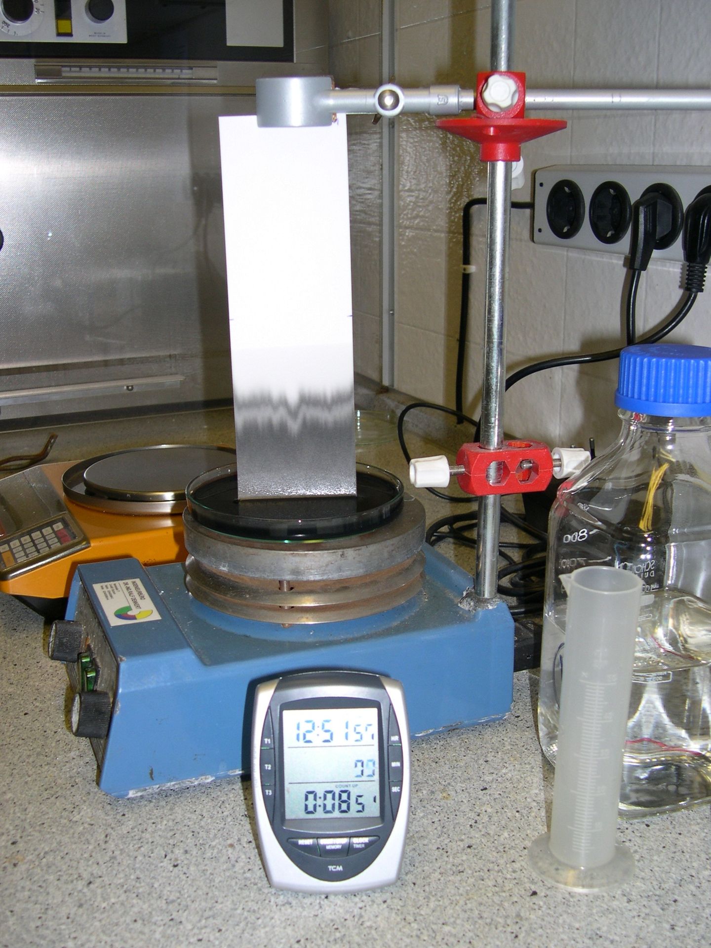 In einer Petrischale werden 50 ml der zu untersuchenden Wasserprobe mit 0,1 ml schwarzer Tusche gut vermischt. An einer Stativklemme wird ein Streifen Filterpapier (VWR Plotterpapier 703, ca. 6,5cm x 21cm) befestigt und in die Probe eingetaucht. Es wird die Zeit gemessen, wie lange die aufsteigende Flüssigkeit bis zum Erreichen der Markierung auf einem Viertel der Höhe (Saugzeit 1) und bis Erreichen der Markierung auf halber Höhe (Saugzeit 2) zum Aufsteigen benötigt. Der Versuchsaufbau wurde leicht modifiziert, da mittlerweile eine andere Papiersorte zum Test verwendet wird.