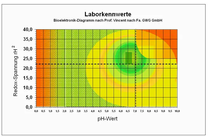 Die Zusammenhänge der einzelnen Messwerte können im nachfolgenden Bioelektronik-Diagramm grafisch dargestellt werden, nach Prof. Vincent und Fa. GWG GmbH.