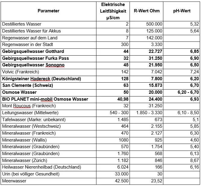 Tabelle 3: Vergleichswerte verschiedener Wässer (Quelle Bio-Planet)