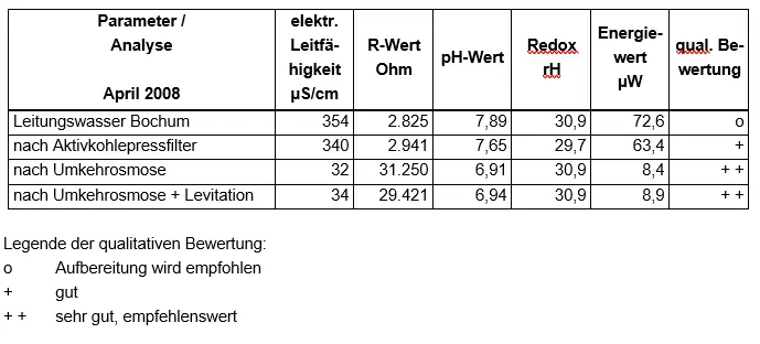 Im hiesigen Wasserlabor wurden verschiedene Wässer untersucht, darunter das über die Hausleitung verfügbare Trinkwasser sowie die im Bioladen/Reformhaus erhältlichen Wasser „Hornberger Lebensquell“ (Quelle Schwarzwald-Herstellerangabe) oder „Lauretana“ (Hochgebirgsquelle Italien-Herstellerangabe) bzw. „Eulenburger Natur Quell“ Wasser. Bei dem „Eulenburger Natur Quell“ Wasser handelt sich um ein Tiefen-Quellwasser aus Osterode am Harz, dass zusätzlich mit verschiedenen Verfahren (u. a. Filtration, Ultra-Kolloidation nach Hacheney, Vulkangesteingranulate) nachbehandelt wird. Zusätzlich sind die Ergebnisse der hier vorhandenen individuellen Trinkwasseraufbereitungsverfahren zusammengestellt.